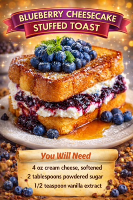 If you’re looking for a brunch recipe that feels bakery-worthy but is easy to make at home, Blueberry Cheesecake Stuffed French Toast is the answer. Thick slices of golden French toast are filled with a luscious cheesecake mixture and juicy blueberries, then cooked to perfection and topped with syrup or powdered sugar. It’s rich, creamy, fruity, and absolutely irresistible.