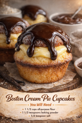 These cupcakes combine soft vanilla cake, rich pastry cream filling, and a glossy chocolate ganache topping. All the magic of Boston Cream Pie, but easier to serve and totally irresistible.