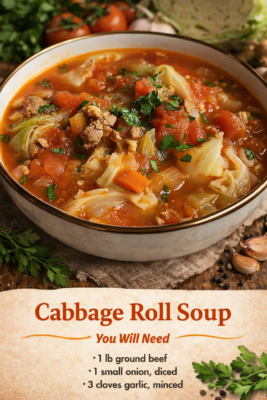 Cabbage Roll Soup delivers everything people love about traditional cabbage rolls in a simpler, more convenient form. With its rich tomato broth, tender cabbage, hearty meat, and comforting spices, it’s a dish that feels like home in every spoonful.