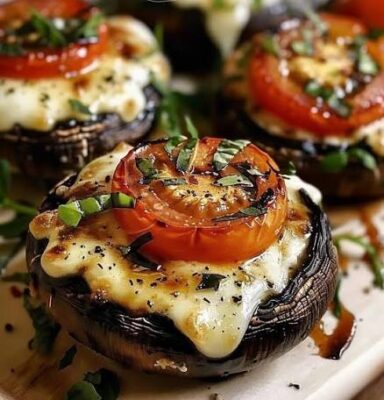Layer sliced tomatoes and mozzarella inside each mushroom. Season with salt, pepper, and herbs. Optionally drizzle with a little olive oil or balsamic glaze.