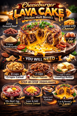 If you love bold comfort food and crave something that’s both dramatic and delicious, Cheeseburger Lava Cake (Molten Melt Bomb) is about to become your new obsession. Imagine a golden, savory “cake” made of seasoned ground beef, wrapped around a molten core of gooey melted cheese. Slice into it, and the cheesy center flows out like lava — rich, indulgent, and completely irresistible.