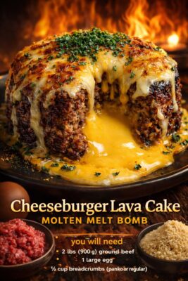 If you love burgers and can’t resist gooey, melted cheese, you’re about to discover a recipe that feels almost too indulgent to be real. Cheeseburger Lava Cake (Molten Melt Bomb) is a bold, creative twist on the classic cheeseburger—crispy and savory on the outside, with a rich, molten cheese center that flows out like lava when sliced.