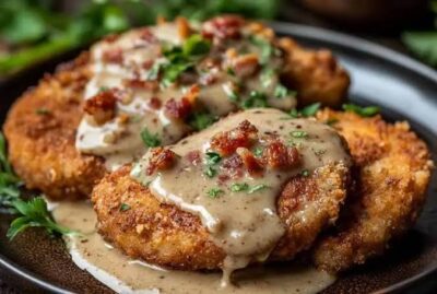 Classic Southern comfort food at its finest—crispy pork chops smothered in rich, smoky bacon gravy.
