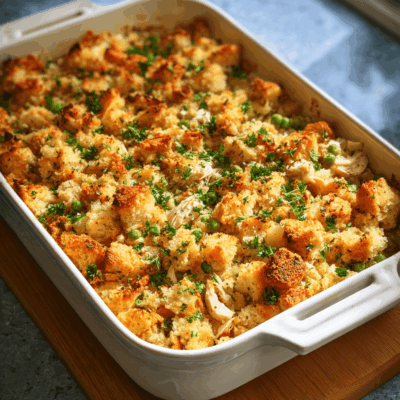 Inspired by classic American casseroles, Dolly’s Chicken and Stuffing Casserole is quick to make, easy to customize, and always a crowd-pleaser. The combination of tender chicken, moist stuffing, and a flavorful sauce will have everyone asking for seconds!