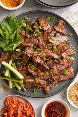 Bulgogi is a marinated Korean beef dish traditionally cooked over an open flame or grill. It’s known for its tender texture, sweet-savory balance, and depth of flavor. While the traditional version uses thin slices of ribeye or sirloin, you can also use flank steak or even chicken or tofu for a quick alternative.
