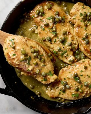 Chicken piccata is a traditional Italian dish made with thinly sliced chicken breasts lightly coated in flour, sautéed until golden, and finished with a buttery lemon-caper sauce.
