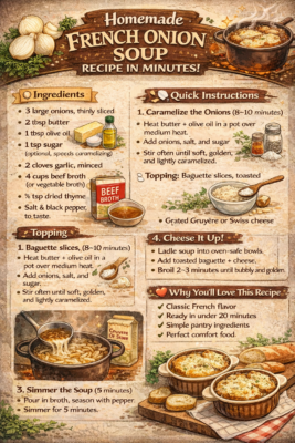 Classic, comforting, and surprisingly quick—this homemade French onion soup recipe in minutes! proves that great flavor doesn’t have to take all day. With caramelized onions, rich broth, and a golden cheesy topping, it’s everything you love about the original, made simple.