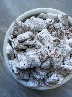 This sweet, chocolate-peanut butter–coated Chex mix dusted with powdered sugar is one of the easiest desserts ever. No baking, no special equipment—just melt, mix, and shake!