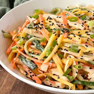 The word kani means “crab” in Japanese, though kani salad is typically made with imitation crab sticks (surimi), which are affordable, widely available, and easy to shred. The salad is tossed with fresh vegetables and a creamy Japanese mayonnaise-based dressing, making it a delightful balance of flavors and textures.