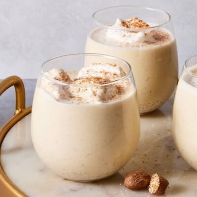 Eggnog is a sweet, creamy beverage made with milk, cream, sugar, whipped eggs, and warming spices like nutmeg and cinnamon. Traditionally served chilled, it can be enjoyed plain or spiked with rum, brandy, or bourbon. Its origins trace back to medieval Britain, where “posset” (a hot milk drink with spices) was popular, eventually evolving into the festive drink we know today.