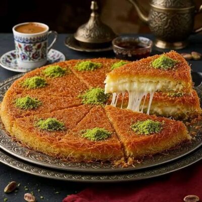 The magic of kunafa lies in the contrast between the golden, crunchy top layer and the gooey, sweet cheese inside.