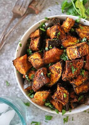 Roasting brings out the natural sweetness of aubergine while keeping the recipe light and healthy.