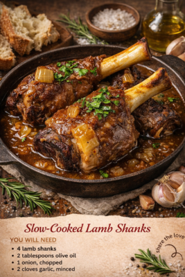 Slow-Cooked Lamb Shanks benefit from long, gentle cooking methods such as braising or using a slow cooker. Over several hours, the meat becomes fork-tender and almost melts off the bone. The cooking liquid—often made with stock, wine, herbs, and vegetables—turns into a rich, silky sauce packed with depth and aroma.