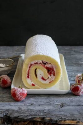Re-roll the cake tightly (without the towel) and wrap in plastic wrap. Refrigerate for at least 1 hour.