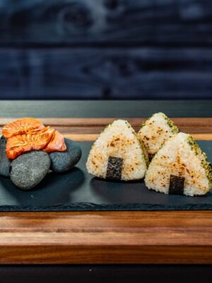Onigiri (also called omusubi) is a traditional Japanese dish made from plain rice shaped into a ball, triangle, or cylinder, often wrapped with a strip of nori (seaweed). Unlike sushi, onigiri uses plain salted rice rather than vinegared rice.
