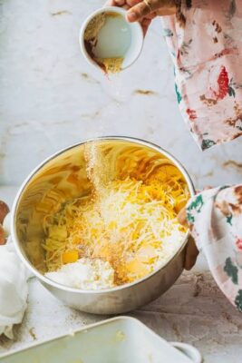 In a large mixing bowl, toss the pasta with most of the cheese, reserving about 1 cup for the topping. Pour in the custard mixture and stir until everything is coated.