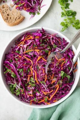 A simple slaw with shredded cabbage, carrots, apple slices, and a tangy vinaigrette is perfect for sandwiches, tacos, or as a side dish. Add a touch of honey and mustard for extra zing.
