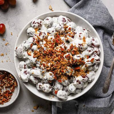 Grape salad is a no-cook dish made with fresh grapes folded into a creamy base, typically using cream cheese and yogurt or sour cream, then finished with a crunchy topping like nuts or brown sugar.