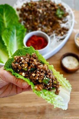 Spoon the warm filling into crisp lettuce leaves, fold, and enjoy immediately.